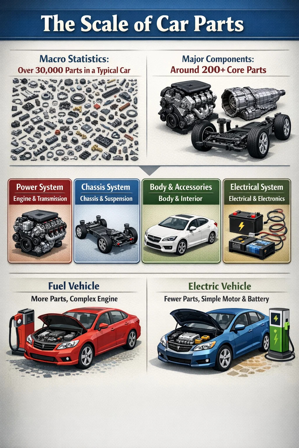 Se cambiamo la nostra prospettiva e consideriamo gruppi meccanici complessi come il motore, la trasmissione e il telaio come singole unità, allora un’auto è composta da circa diverse centinaia di componenti principali principali. Questa classificazione è più vicina a quella che di solito sentiamo nelle officine.