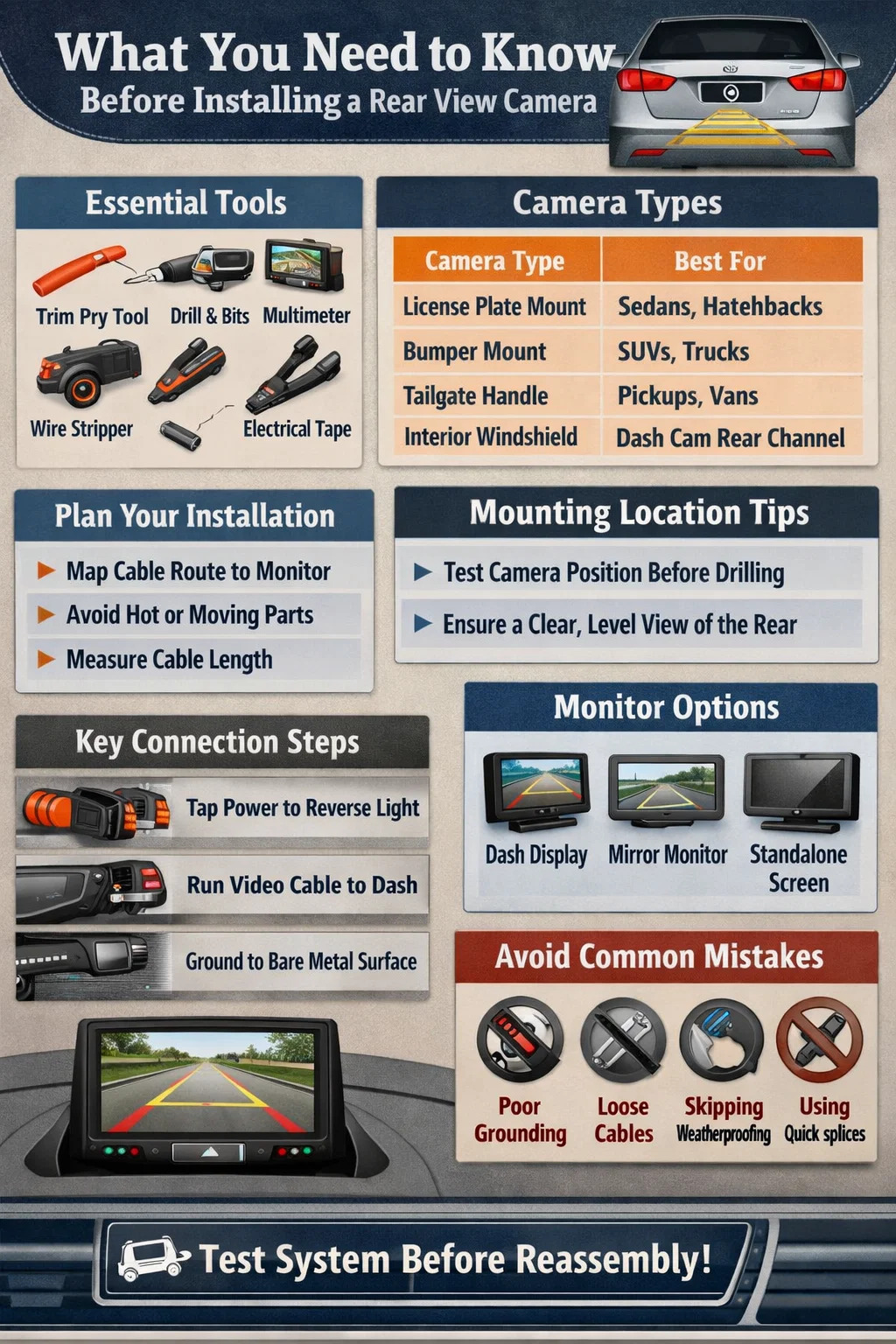 Una telecamera per la visione posteriore è uno dei componenti automobilistici più pratici legati alla sicurezza che puoi aggiungere a qualsiasi veicolo. Se installato correttamente seguendo i passaggi descritti in questa guida, garantisce anni di servizio affidabile, elimina il rischio di indietreggiare contro ostacoli invisibili e può essere un fattore decisivo per evitare incidenti a bassa velocità nei parcheggi, situazioni che rappresentano circa Il 20% di tutte le collisioni di veicoli segnalato annualmente nei principali mercati.