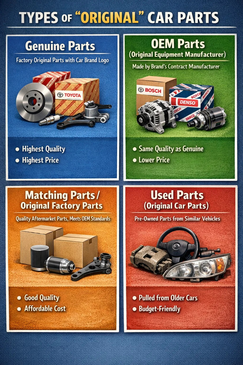 Quando si parla di ricambi auto "originali", in realtà vengono utilizzati diversi termini. Anche se possono sembrare simili, in bocca ai meccanici o ai proprietari di negozi di ricambi per auto, questi termini diversi spesso rappresentano prezzi e origini diverse. ricambi auto .