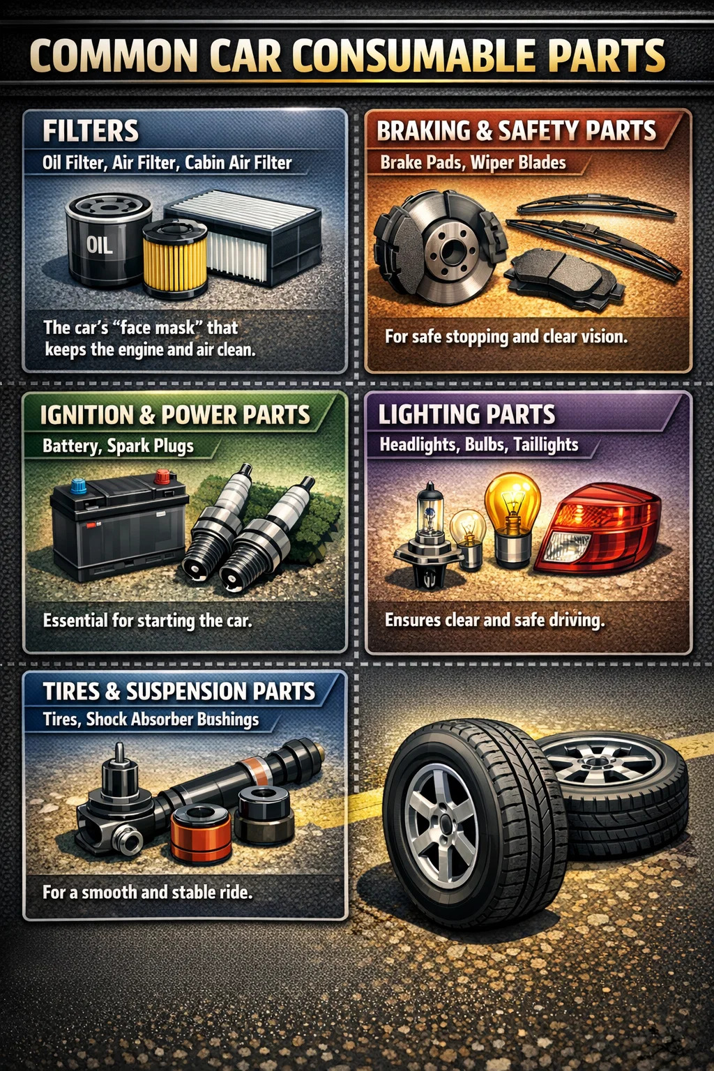 Nel mondo delle automobili, alcune parti si consumano rapidamente e sono molto richieste, rendendole facilmente disponibili presso qualsiasi negozio di ricambi auto o officina di riparazione. Queste parti dell'auto sono comunemente denominate "parti di consumo" o "parti di uso comune".