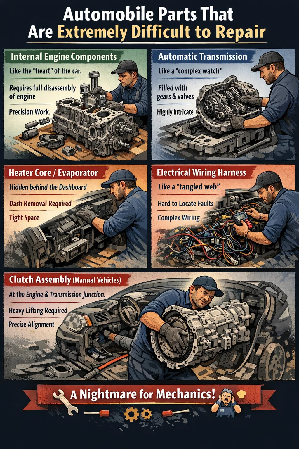 Nel settore delle riparazioni auto, alcuni parti di automobili sono un "incubo" da riparare per i tecnici. Ciò non è dovuto al fatto che le parti stesse siano costose, ma perché la loro posizione è così difficile da raggiungere o la loro struttura è così complessa, rendendo le riparazioni lunghe e laboriose.