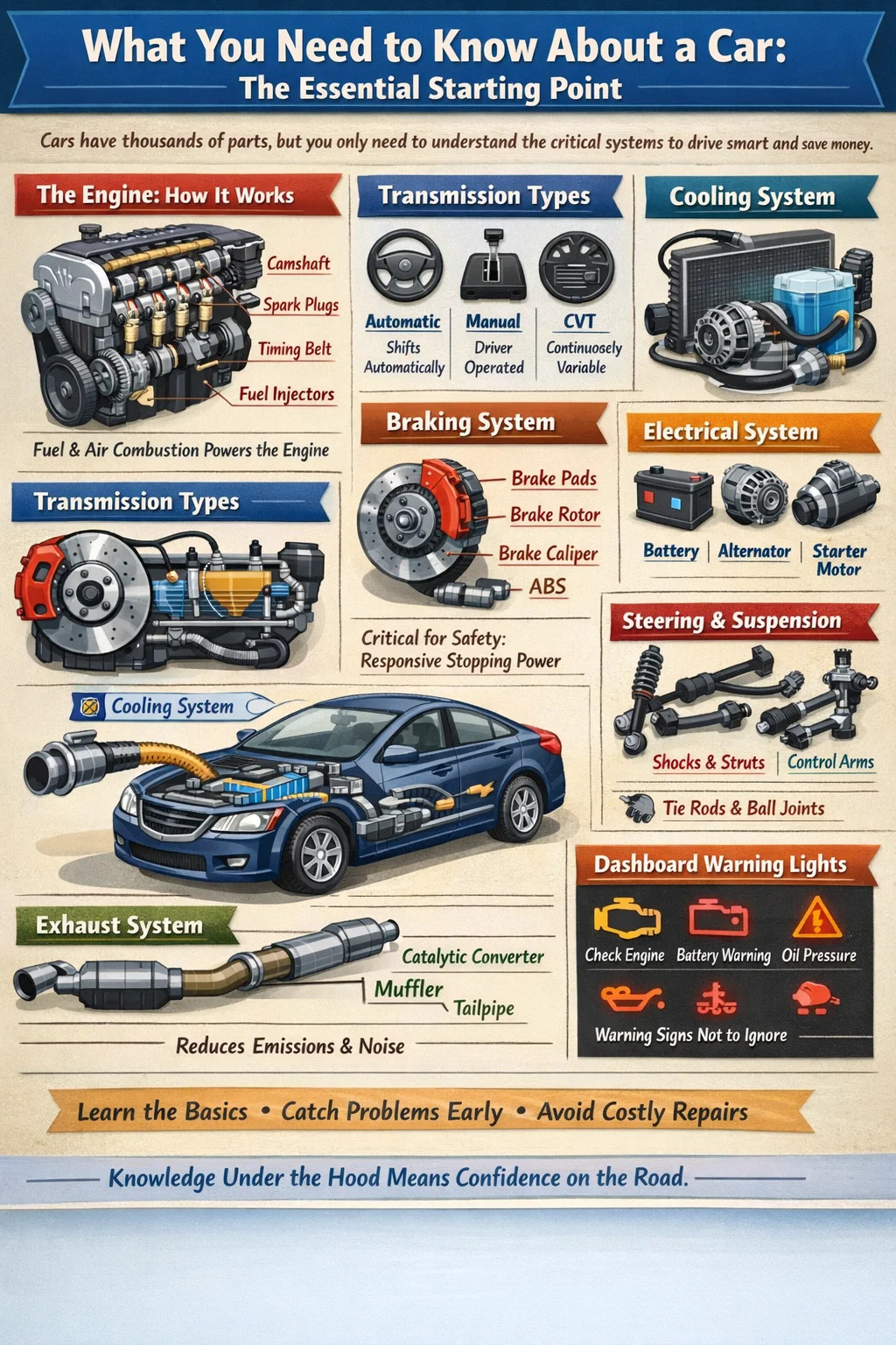 Che tu sia un acquirente per la prima volta, un nuovo guidatore o qualcuno stanco di annuire al meccanico, conoscere i componenti chiave della tua auto ti dà vera sicurezza. Coglierai prima i segnali di allarme, farai domande migliori ed eviterai riparazioni di cui non hai effettivamente bisogno.